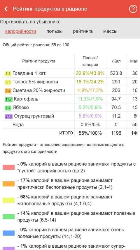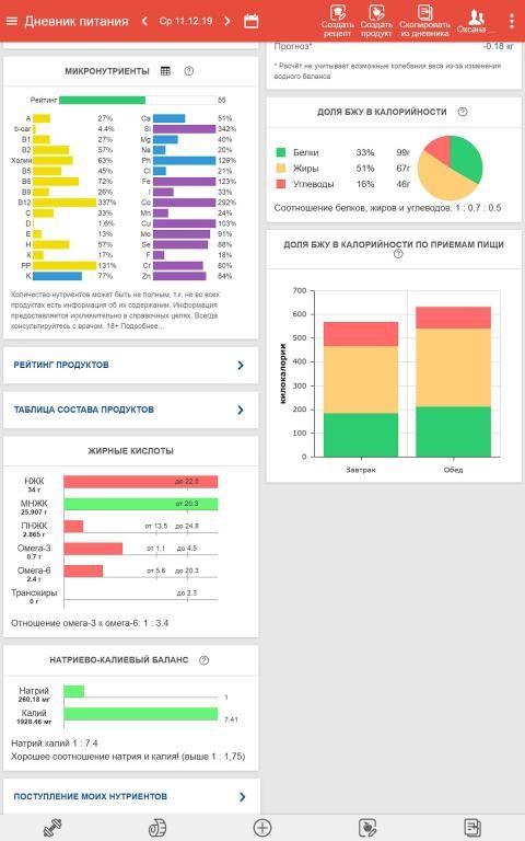, источники нутриентов, рейтинг продуктов в рационе и другие отчёты.