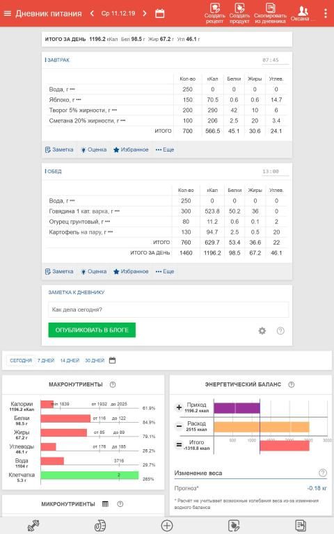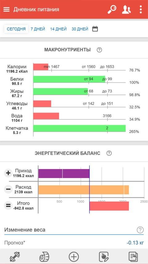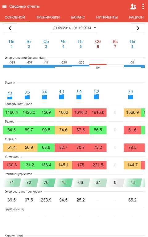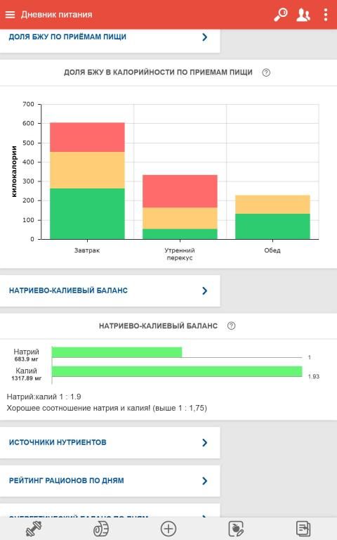 по каждому приёму пищи (до 9 приёмов пищи) и за день, в граммах и процентах от нормы. Соотношение белков, жиров и углеводов в процентах от калорийности.