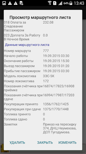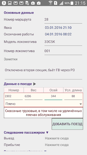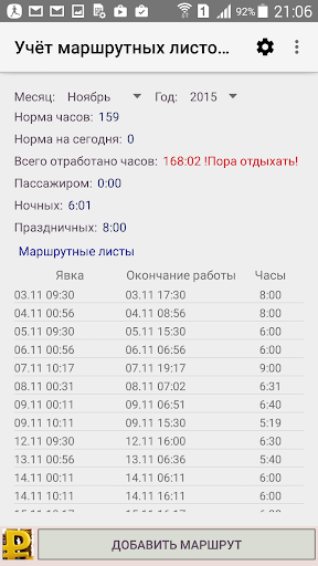이 응용 프로그램은 기관차 여단의 근무 시간을 설명하기 위해 작성됩니다. 라우트 데이터 (투표 및 작업 종료)를 만드고 응용 프로그램에 저장하십시오! 이제 당신은 단위, 회계사, 경제학자의 오류의 희생자가되지 않을 것입니다. 당신은 항상 당신이 일하는 몇 시간 동안 몇 시간을 알고있을 것입니다.