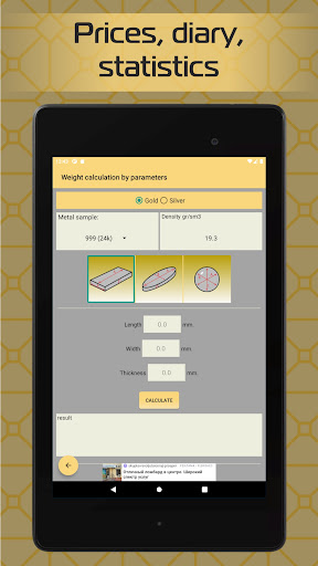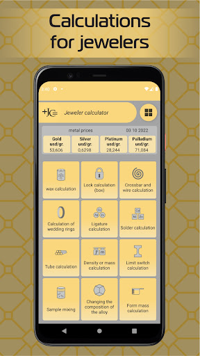 The Jeweler's Calculator application was created to simplify calculations and save time on calculating the necessary parameters. We have tried to collect in one application all the necessary calculations that a jeweler may need in his daily work.