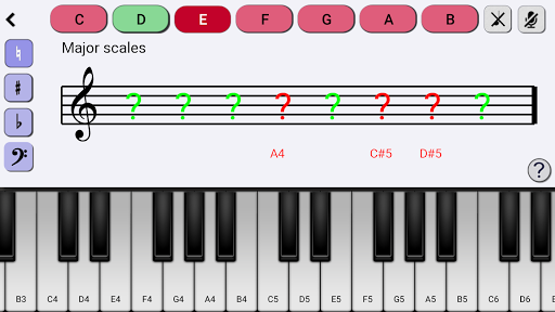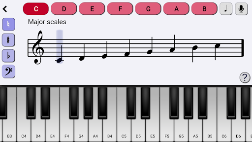 The second mode provides all major scales for all keys, for both the treble and bass clefs. For best practise, there is a hidden mode feature, in which the notes to play are hidden, so you need to play the scale by heart, the ultimate demonstration of your note recollection skills.