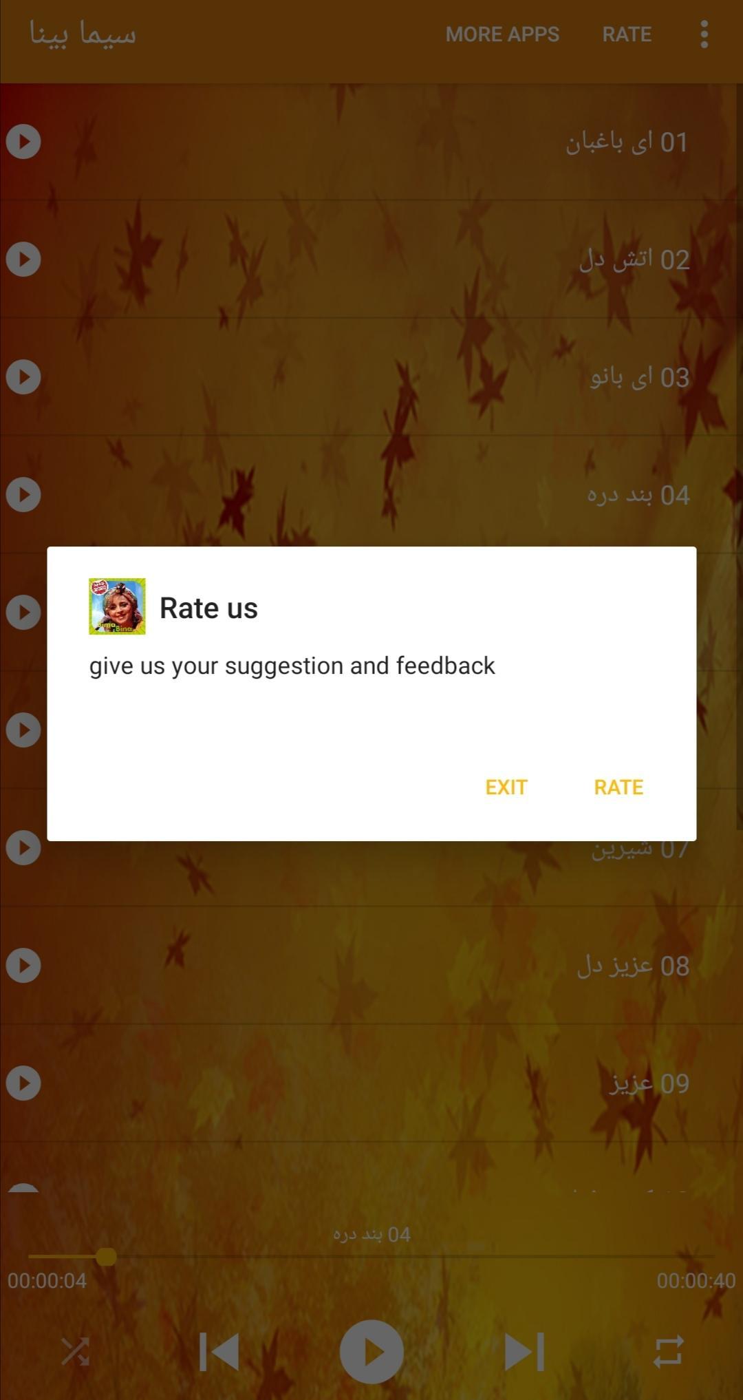 لذت بردن از موسیقی ایرانی با استفاده از این برنامه جدید و رایگان که بدون اینترنت کار می کند. ما بهترین خواننده های ایرانی را با بهترین کیفیت از ایران جمع آوری می کنیم.