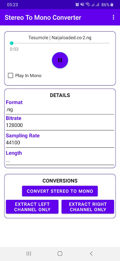 This audio utility app allows you to convert your stereo audio to mono audio for your pleasure. You can convert any song or music from stereo to mono.