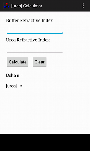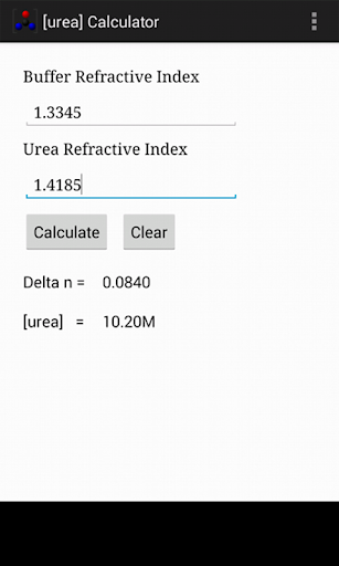 Refractive index is the most accurate way to analytically determine the concentrations of aqueous urea solutions. The Urea Concentration Calculator calculates the concentration of urea in a solution from the difference in refractive index (deltaN) at the sodium D line according to the data of Warren and Gordon (Warren, JR and Gordon, JA (1966) On the refractive indicies of aqueous solutions of urea. J Phys Chem, 70:297-300). Inputs are the refractive index of a buffer aqueous solution and a similarly buffered solution containing urea. Outputs are deltaN and the molar concentration of urea. Aqueous urea solutions are commonly used in studies of protein denaturation.