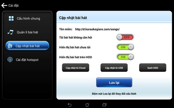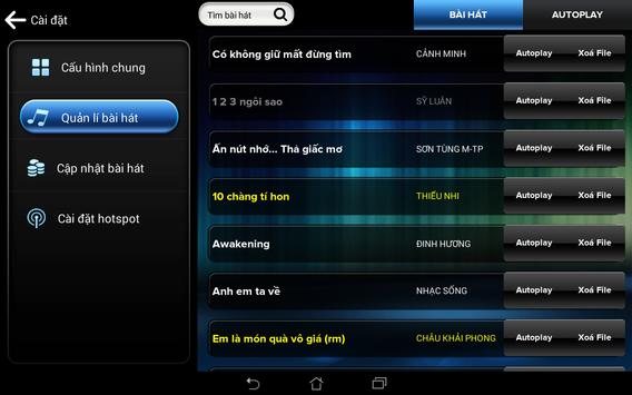 Hỗ trợ người dùng tương tác với đầu Karaoke Audio một cách tiện lợi nhất. Ứng dụng điều khiển karaoke này có thể giúp bạn tra cứu, chọn bài nhanh, điều khiển (start, pause, stop, next, tắt mở giọng ca sĩ, bài hát yêu thích) thiết bị đầu Karaoke Audio thông qua thiết bị cầm tay smartphone/tablet của bạn