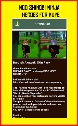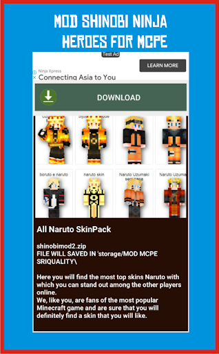 If you are really crazy about naruto ninja, what are you waiting for you should try the free application Mod Shinobi Ninja Heroes for Mcpe. Very easy to use and I hope you are satisfied.