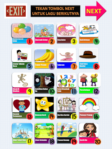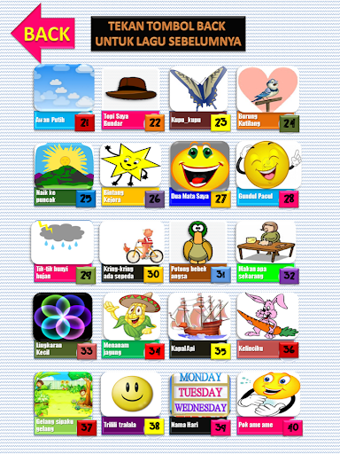 Indonesian Children's Song consists of 40 rows of songs that are ready to accompany the children in appreciating music as well as a means to learn to memorize and speak.