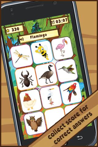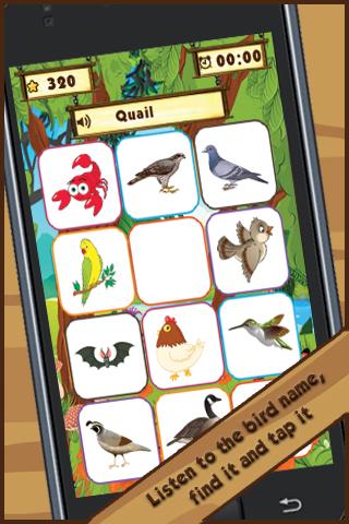 Lets see which of the birds you can recognize?As a parent we keep thinking of how to make learning fun for our kids. Here39;s an app which aims to do just thatHow?Playing is as simple as listening to the bird name and finding it in the grid of birds. If the kid cant find it don39;t worry the bird will bounce in a few seconds. You would be amazed to see how quickly kids start recognizing the birds. Kids have fun earning stars on every correct answer. As they progress they can take up timed challenges. And you can check out the score card to see their progress.Features: Very easy and simple fun game Beautifully illustrated bird images Clear pronunciations Aids self learning with animated hints Difficulty levels to match the abilitiesage of your childIt helps your child to: Develop auditory, visual and fine motor skills Recognize birds Relate birds to their names Develop sense of achievement