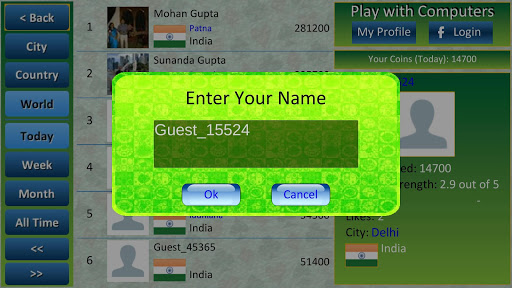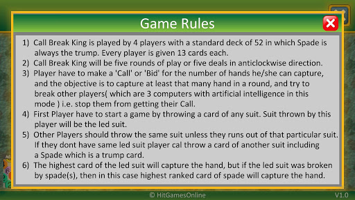 3) Player have to make a "Call" or "bid" for the number of hands he/she can capture, and the objective is to capture at least that many hand in a round, and try to break other players( which are 3 computers with artificial intelligence in this mode ) i.e. stop them from getting their Call.