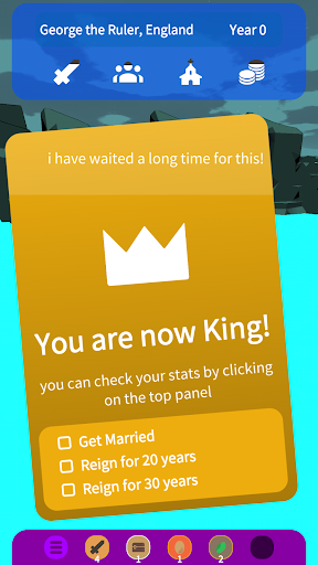 Certain events will determine the future of your kingdom. Marry a beautiful or smart queen, trade with merchants, witches and your towns people. Keep your peoples faith in check to avoid calamities. Go to war with rival kingdoms. Earn money every year as the ruler of the kingdom.