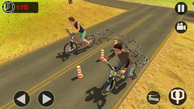 In this Chained bicycle BMX stunt bike rider you have to perform some crazy BMX stunt with your rival chained bicycle BMX bicycle rider on Off-road Highway Tricky Tracks against the ramps to beat your rival