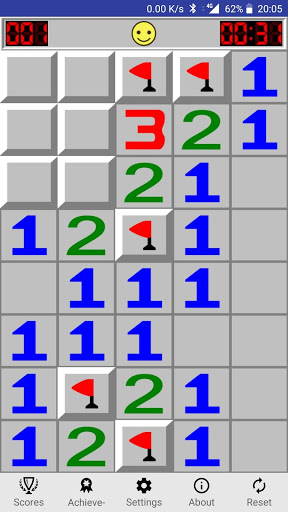 This game originates from the 1960s, and has been written for many computing platforms in use today. The objective of the game is to clear the board containing hidden "mines". Minesweeper starts when a you tap on a cell. The first click is always safe and reveals a number or an opening surrounded by numbers. Each number tells you how many mines touch the cell. You can mark a mine by putting a flag on it with the long tap. If all the mines touching a number are flagged, you can press both buttons on that number to clear the remaining adjacent squares.