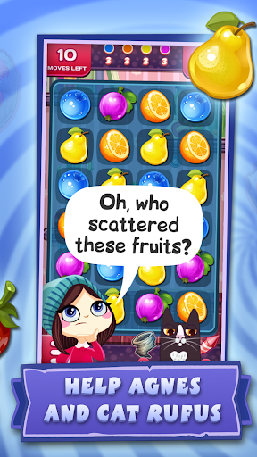 Switch and match juicy fruit 3 in a row, get points and jewel. But if night falls, the cat Rufus changes all the rules! At night, you need to connect the same fruit with a line of three in a row and more. Crush and match three fruits, solve exciting puzzles and find secret treasures with boosters!