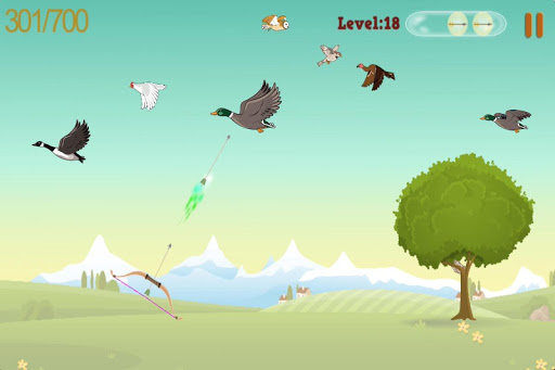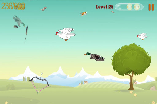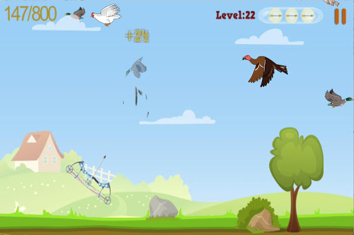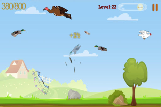 - Use the bow and shooting the duck, goose, chickens, birds, owls ... flying in the sky.