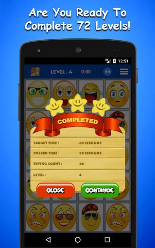 * The most exciting part of the game is the challenge mode. In this mode, there are 72 levels to be completed. Game gets harder at every new level. Placement of images are changed randomly during each play. Your brain will be challenged at various levels. If you reach 72nd level, it means that you have a proven visual memory!