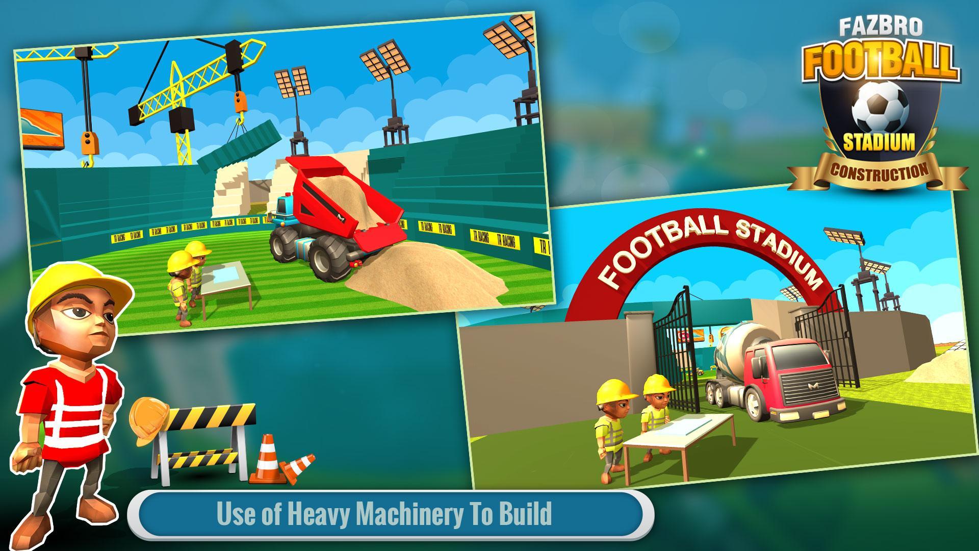 Football Stadium Builder Construction Crane Game a simulation game based on real construction to be a new city builder and be a part of the construction crew in heavy construction zone for a stadium construction game with heavy construction vehicles, using a heavy excavator crane & construction truck for building a football stadium using a cement truck in stadium construction games. Welcome to Fazbro Studio where you get best construction games of 2018 in new free construction games including city building games by heavy construction vehicles in constructor simulator. A new football stadium building game launched by FAZBRO after the great success of crane games as building construction games & house building games. Be the best city builder or a crane operator through construction truck, heavy excavator crane & cement truck by playing best building game as stadium construction game. This Building Construction game is always available on play store for android mobiles and tablets. Download now this best building game or football stadium builder game and experience free construction games like house building games or construction site games being a city builder in craft games & crane games.