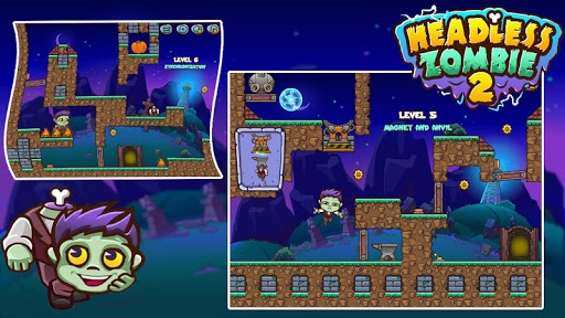 , Carl. Poor old Carl. Once a rich bloke with nothing to lose or so he thought 'til he lost his head. What? Too soon? Long story short, Carl is stuck in his undead form but with a little help from that wonderful electricity genius we all know and love maybe he can bring our charming little Carl back to life. That's right, kizi brings us the second installment of this zombie platform puzzle, Headless Zombie 2, where Tesla is willing to help bring our hero back to life as long as he agrees to find the cogs Tesla needs strewn throughout levels. As before, Carl can pop off his head and use it to press switches and so forth, even if that head is a robotic substitute... though there's nothing like the real thing, so Carl still needs to have his head on his shoulders before he can go through a level's exit. That robot head has its own uses, however, and in addition to being a surrogate noggin, if it touches any electric orbs it'll be charged so that if it's placed on (or lands on!) a robot body, it'll move on its own, and can even be used to activate other electrical components like magnets... handy if you, say, have an anvil for a head, which you very well will. Sometimes Carl's head may land on a different body, and when that happens, both it and his headless body will move at the same time... just be careful, since a robot torso may be fireproof, thus allowing you to get through flames safely, but Carl's good old zombie body is not, and those electric balls can burn you up good too!