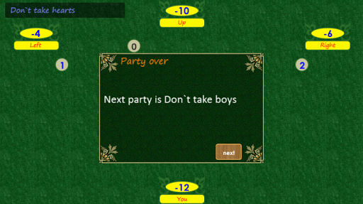 The first move in the game is randomly assigned. The first move in the party shifts from one party to another in sequence in a clockwise direction. In the process of playing the first move goes to the one who win a last trick. Make the first move in the Hearts at the parties to TAKE-NOT to TAKE hearts, KING, EVERYTHING is impossible while the player has cards of other suits. In the remaining games the first move can be done with any card. Next, clockwise, go to the other players. They must put the card of the same suit as the first. If the player has no hands the suit can discard any card in their discretion. Trick wins the player who put the highest card of the suit of the first card in the trick.