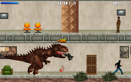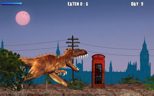 You are a Tyrannosaurus Rex in the middle of London. As you make your way out of it, eat humans including policemen and ordinary citizens, destroy cars and houses, and battle helicopters, tanks, and a lot more armored vehicles.
