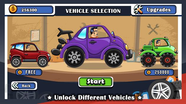 Face the challenges of unique hill climbing environments with many different cars in the hill climb car racing game. Gain bonuses from daring tricks and collect coins to upgrade your car and reach even higher distances.