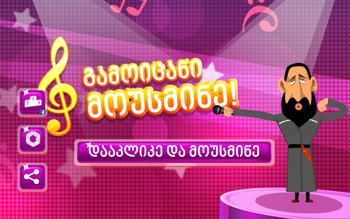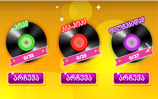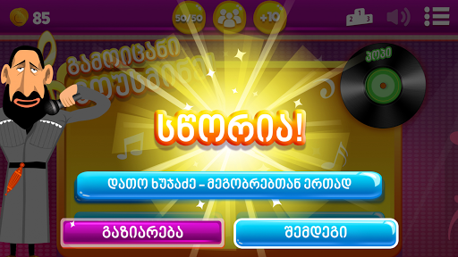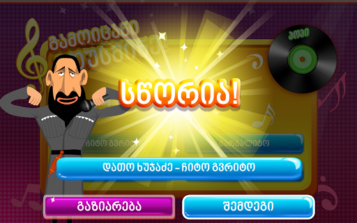 The rules are simple. Listen to actual Georgian and foreign songs, featuring music from all your favorite artists and shows you 4 answers, of which only 1 is correct. With the correct answer, you are credited with bonus coins. Challenge with your friends and play against music lovers worldwide!