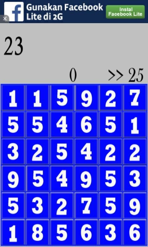 Permainan Angka adalah permainan dimana anda harus mengejar angka target yang telah di tentukan.dengan cara tab angka-angka yang berada dalam kotak.yang dimana kalian harus berpacu melawan waktu.