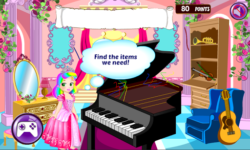This princess piano game has all the characteristics of a great app, you get the chance to play the piano, find hidden objects and record songs.