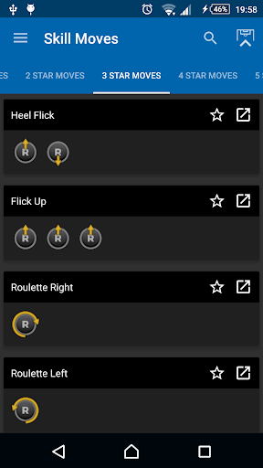 - Learn skill moves such as: Body feint right, Stepover left, Reverse stepover right, Ball roll left, Drag back (while standing), Heel flick, Flick up, Roulette right, Fake left & go right, Ball hop (while standing), Heel to heel flick, Advanced rainbow, Spin right, Stop and turn left (while running), Ball roll cut right, Elastico, Hocus pocus, Triple elastico, Rabona fake (while jogging), Elastico chop left, Laces flick up, Sombrero flick left, Around the world, Reverse in air elastico, Chest flick,