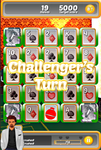 Use Poker Chips to buy power up cards, Boosters, and unlock higher Poker Crush Tables. Clear tables with your crushing skills and play against Challengers that stand in your path as you make your way to face the elusive Mr. Crush!