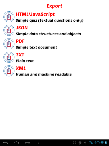 The application supports text, image and audio type content. Data can be backed up to various file formats including JSON, XML, PDF and TXT. It is also possible to back up a whole database with a single click. HTML/JavaScript version of the quiz can be easily generated for selected category.