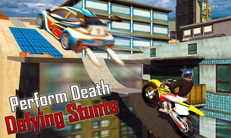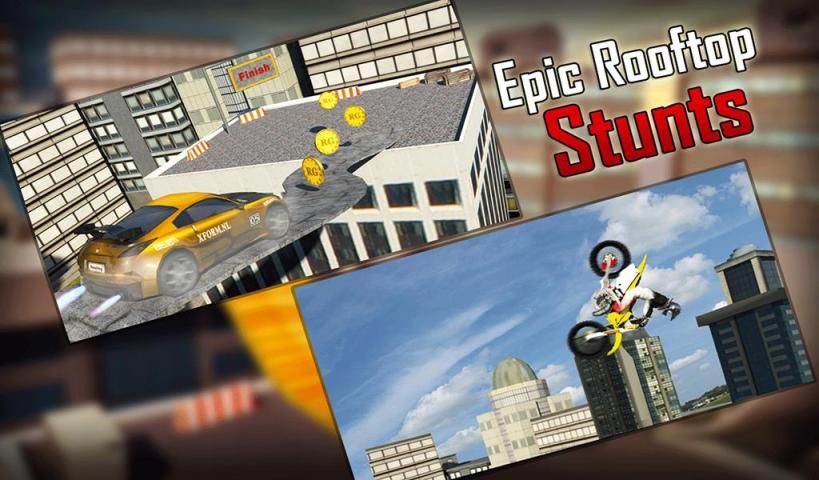 Install and play Rooftop Bike Stunts Car Escape - latest moto racing 3D game for flying rooftop driving adventure.
