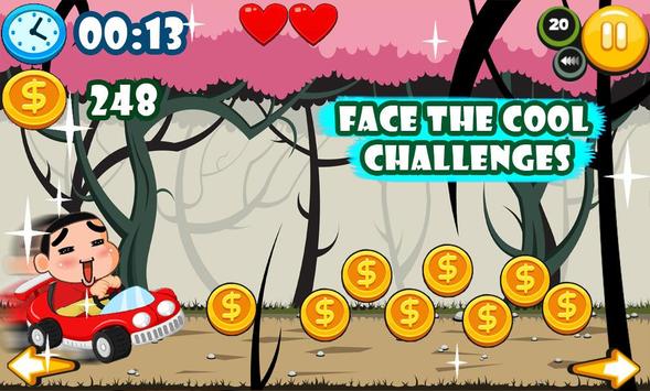 take control of your car with your little kid just by tap two fingers and see the car jump and roll and move forward or even fast backward, this creative shinchan games adventure car racing is not like other games for your child where it may get too difficult, complicated or get too boring, This game is not boring and very addictive levels and missions, it's a great way to play and have fun...