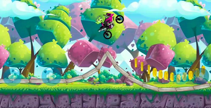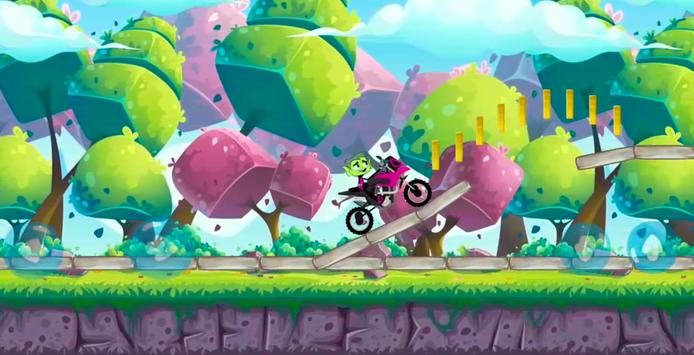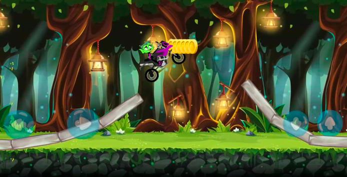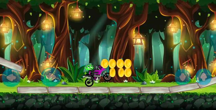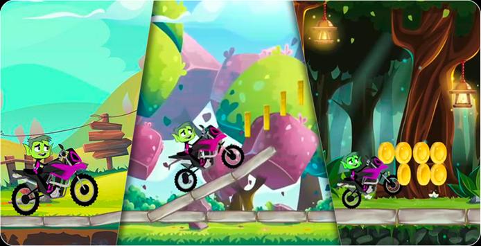 Drive faster with Super Beast Boy go motobike and jump with your super motorcycle over all obstacles and collect coins to reach new titan worlds, full of funny people monster, flowers and trees.