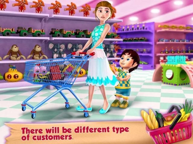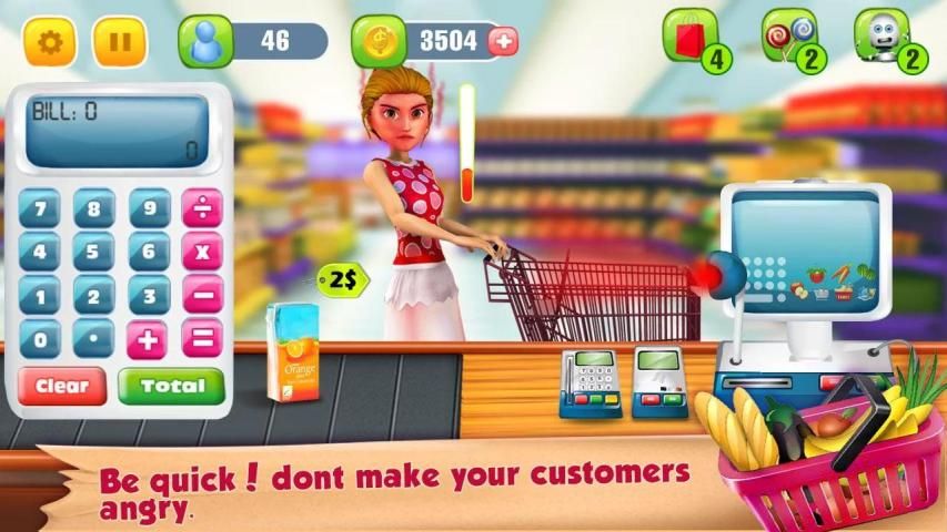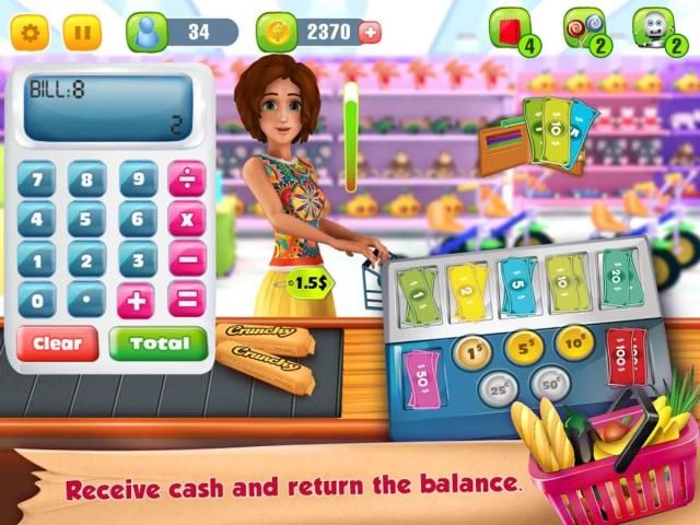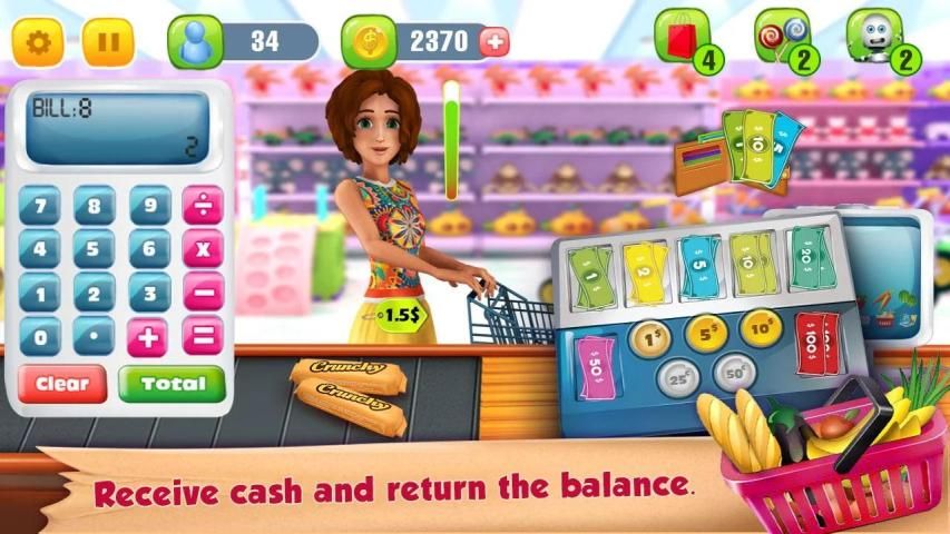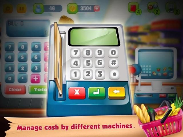 Supermarket Grocery Cashier starts with a manual machine you have to enter the price of each item and get the total of all items. Tap on the customer to receive money. Cash drawer will open and you can put the received money and return the balance amount to the customer. You can upgrade your manual point of sale, with the automated one so you can scan each grocery item the customer brings to the counter, and ring up the price! Then accept payment via cash, credit card or through mobile NFC, and enter the total amount, followed by scanning the credit card or mobile! Supermarket Grocery Cashier is an educational and fun game where children learn to handle money at a store in shopping mall. It can help improve their math and calculation skills.
