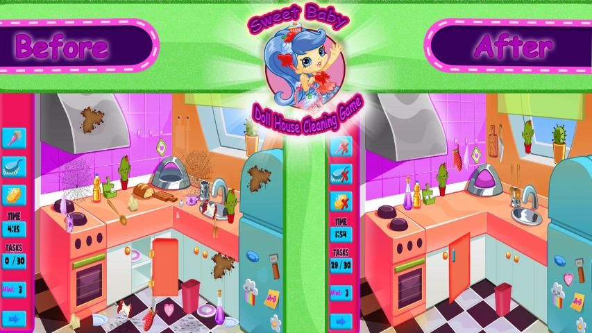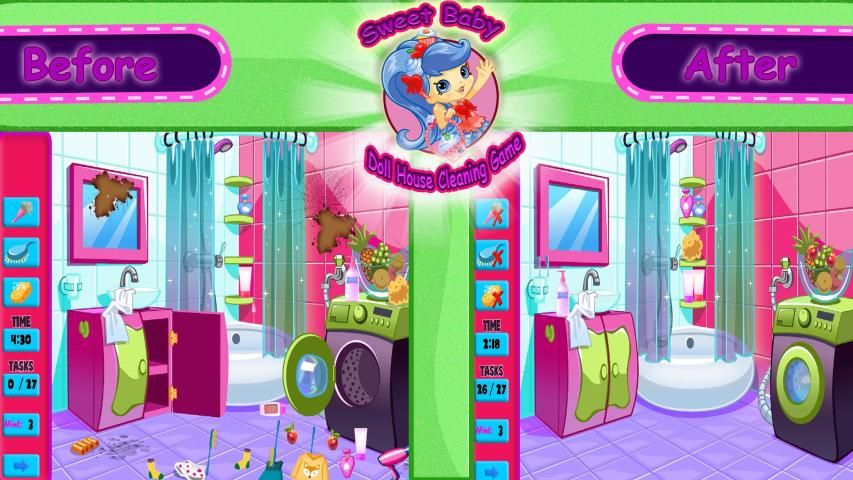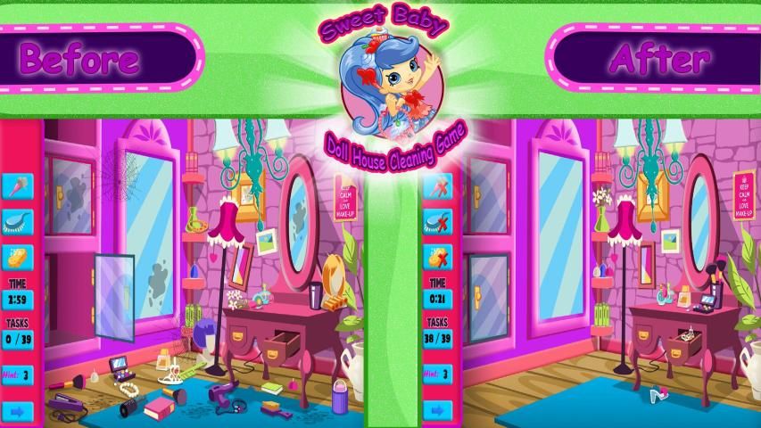Sweet baby doll house cleaning game is bringing fun features that makes this messy house cleanup game different from other doll house games for girls. Try to manage all scattered things back to their right place. Cleaning games for girls with levels will make you excited about doing housework and making your dirty house clean and tidy all the time.