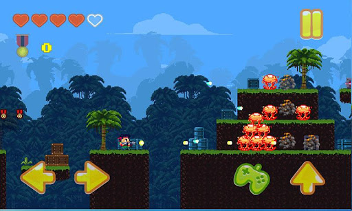 Playing for our brave character, you move forward on the level at the same time destroying the aliens attacking you. Aliens can be on guard, and can constantly appear from a special portal. In this case, it is necessary to destroy the portal in order to interrupt the invading of enemy soldiers on our planet. Also, the hero will be threatened by turrets that can fire in a circle. In order to dodge from enemy bullets, the hero must jump up. During the passage of the level should conduct continuous fire on the enemy. In order to increase the points you need to collect medals, scattered around the level. The number of collected medals affects the quality of the passage level. To replenish health you need to pick up the heart. The player needs to very actively and accurately jump from one platform to another.