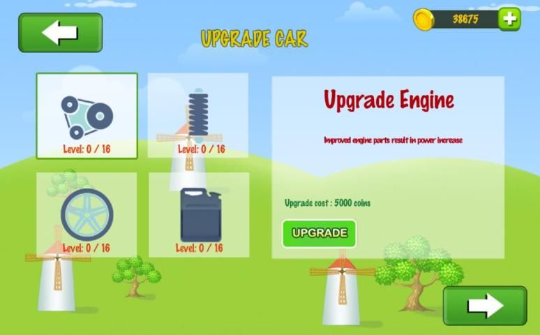 - Upgradeable parts include engine power, tires friction, and tank size