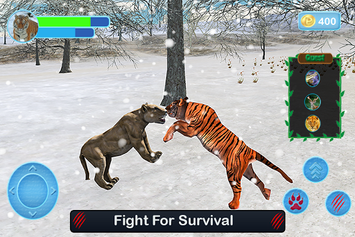Experience the ultimate extreme wild life full of the adventures of angry wild tiger. Play as wild tiger survival simulator and survive in the wildness as long as you can. Start your own pride of wolves, fight for your life against fierce animals like crocodile, bear and wolf and lion. You have a tough competition with clever fox in jungle. Play as mountain giant wild cat in the arctic jungle and move around for the fresh forest attack. Show the wilderness and anger of a wild white tiger! Search for food and fight for survival, Spot your territory, hunt animals, Eat, Drink, Sleep in winter Complete animal killing hunts with multiple types of power attacks including claw, jump and bit attack for killing the animals. In this animal hunting simulator game you will experience the HD Graphics with realistic 3d angry wild tiger simulator in the day and night cycle of jungle. Live the as the king jungle and enjoy life of safari jungle. Increase the size of your pack by breeding with a female tiger to give birth to baby cubs. Ensure the protection and safety of your cubs. Raise your family and become the King of the Jungle. Protect the cubs from dangerous animals that roam freely in the wilderness.