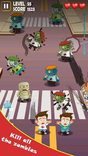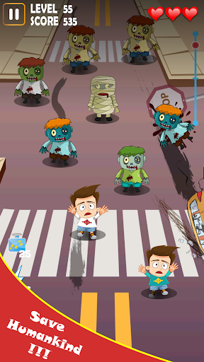 To protect people from the invasion of zombies. Use your fingers to click on the zombies to hit and eliminate them before they pass. They are very crowded, so be quick finger. The higher the level the zombies will move faster. And your fingers must be faster. There are special types of zombies you need to pay attention to: Fat Zombie: Need to hit 10 times to kill it. Zombie Teleport: Can move instantly. There are also zombies that are equipped with helmets. You need to break the helmet before killing the zombies. And remember never touch the boy. Your task is to protect him from zombies. If you kill him, you lose.