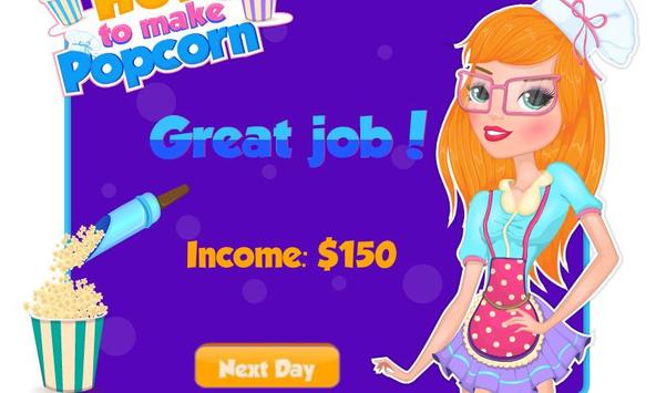 Hi girls. Let's play a new awesome girl game. You have a shop business with a lot of customers. They came to your shop to buy popcorn, flavor, drinks, and candies and your mission is to serve them as quickly as possible because they don't like to wait to much. Get ready to begin the work because the customers are about to come. As you correctly serve your customers you must collect them money and complete the level. In each level you must reach a certain amount of money to go further. Every customer asks for something and you must serve him quickly with the order demanded. Select the correct popcorn box, fill it with popcorn, add topping and give to the customer before he leaves and collect money. This cooking game is a challenge so prove that you are a good seller. Have fun and leave us a review if you like this popcorn maker game.