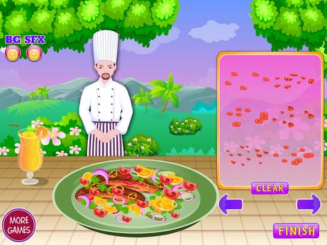 In this game you have to prepare a fried fish with a few added ingredients to get a better taste. You must enjoy this day because you will learn to cook a new dish, and you have a very beautiful landscape. First you have to clean the table on which we will work to remove all the leaves and wash well. Then you must arrange all ingredients on the shelf, so you can get easier when we need them. After that you have to mix a few ingredients to prepare the sauce. You must mix the onion, garlic, salt, Pieper, olive oil, tomato sauce, Vani extract, brown sugar and less red. After that you have to mix all the ingredients to form the dressing. Then we have to take the fish, add the sauce over it and tuck it in the fridge for a few minutes. Then we remove the fish and put it on the fire to fry very well. After the fish fry must take a range and put two pieces on a plate. The fish is ready, but we can not serve it. We need to add a few decorations to look much better. We need to add tomatoes, onions, garlic, oranges, peppers, and a drink near the plate. Thank you for choosing this game and invite you to choose and other cooking games and games of this developer to see if you're doing as well as you did before.