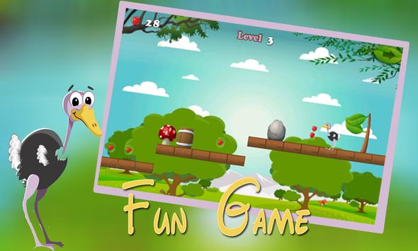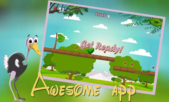 to collect as much as cherrys and complete the levels in the forest. Tap to jump and double tap to double jump and escape the pitfalls. It is fun Jungle Ostrich running and jumping game.