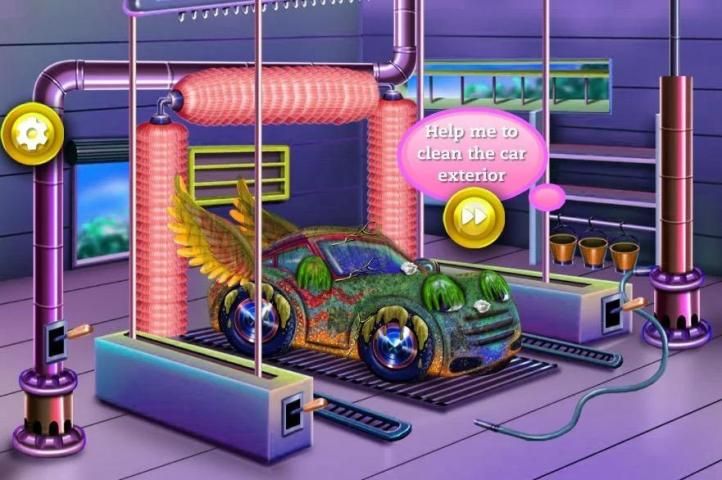 needs you to help her clean it up. Start with the front sit and throw away the trash, clean the doors, windows and sits because they were covered in dust, also vacuum the sits and sew the tore leather. Now move on to the back of the car and follow the same steps. Now it's time to clean the car in the exterior. Start by removing the trash, brush the dirt off the wheels, then use professional car wash tools to rinse, add soap, brush, rinse again and dry. Also fix the parts that are bent. Now that the car is clean you can decorate it with new colors and prints, mirrors, windows, wheels and even a cool pair of wings. Now her car is amazing and looks like brand new! Have a blast playing Car Wash!
