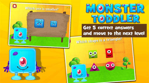 This game teaches toddler shapes, big vs. small, numbers 1-10, letters of the monster alphabet, and to be able to recognize which object does not belong to the group. This toddler game consists of 12 different learning level boards or mini educational games for kids to learn, ordered from easy levels to harder and more challenging levels.
