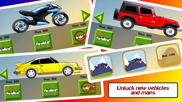 Crazy Hill Race 2015 is a simple yet very exciting game that you can play on your Android phone or tablet. Beware of this game's ultra-addictive nature, because this physics-based hill climb race game will grab your attention, eat all of your spare time, and will never let go! Challenge yourself and your friends in competing for the best score in various cars and stages you can unlock by playing. Collect the coins that are scattered in your path, do insane jumps and tricks, then use the money to trick out your ride and go even further.