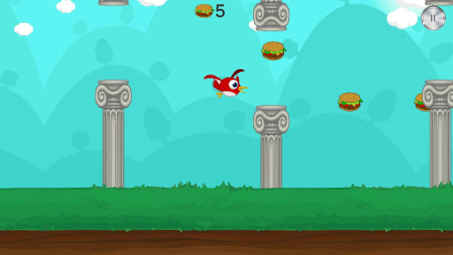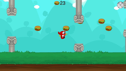 Play Crazy Bird Game with Cute Bird, tap to jump and avoid pillars and eat burgers to increase your score.