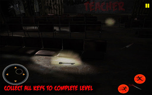 In this creepy game first of all you have to enter the school but you have no school lock key. So find the key to open the main gate of school. Now enter the school but beware of a scary teacher who is roaming near you. Now the teacher has locked the school gate and you are caught up. Go and find a map of school so that you can escape otherwise the teacher will kill you. Ah ! well done you found now follow the arrow sign and search the 2nd door to escape.