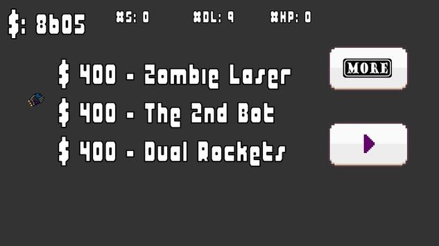 Laser flak cannon! prefer rockets? Homing rocket can also be selected. If all else fails, buy support bots that shoot for you! Zombie mode entitles you to shoot your own zappy birds at the enemy. Remember to collect coins to buy new items!