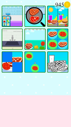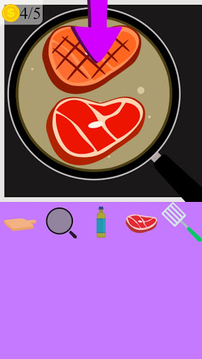 make sizzle steak game. cooking and making sizzle steak. spice the steak in kitchen. make steak on a pan. add potato chips and vegetables.