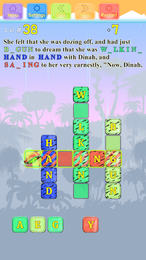 Our game is a fun and colorful, enormous collection of Crosswords that tell the whole story of Alice's Adventures in Wonderland. Alice falls through a rabbit hole into a fantasy world of wonderful creatures. You will have a great time recreating the classical beloved story from the book by Lewis Carroll with the completion of each crossword. We bring to you the whole story that you can fully enjoy in your own rhythm. It is fun to read, but it can be just a little bit too boring sometimes, that's why our game adds a crossword puzzle to the reading, that keeps your brain stimulated while reading. You actively think about sentences and complete the missing words in an interactive and engaging experience that allows you to focus on the meaning of the words and not just passively repeat words in your mind.